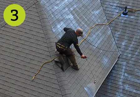 Before treating, Roof Savers will perform a tune-up of your entire roofing system with the focus on re-sealing chimney flashings, seal down loose shingles, nail down pop up nails and seal. We also replace dry rotted pipe boot collars and if needed, paint turtle backs. Then we will softwash the roof to remove any algae, moss or dirt from the shingles.